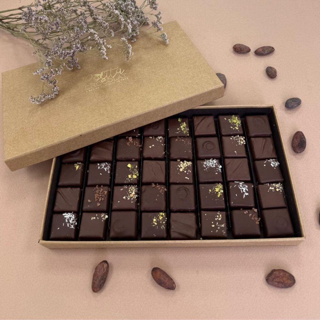 40 bonbons pralinés avec un enrobage chocolat Palo Santo Équateur et un praliné légèrement croustillant en bouche.