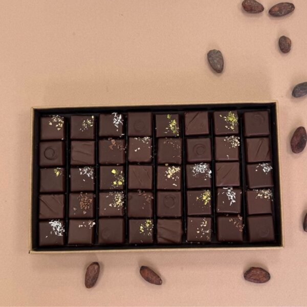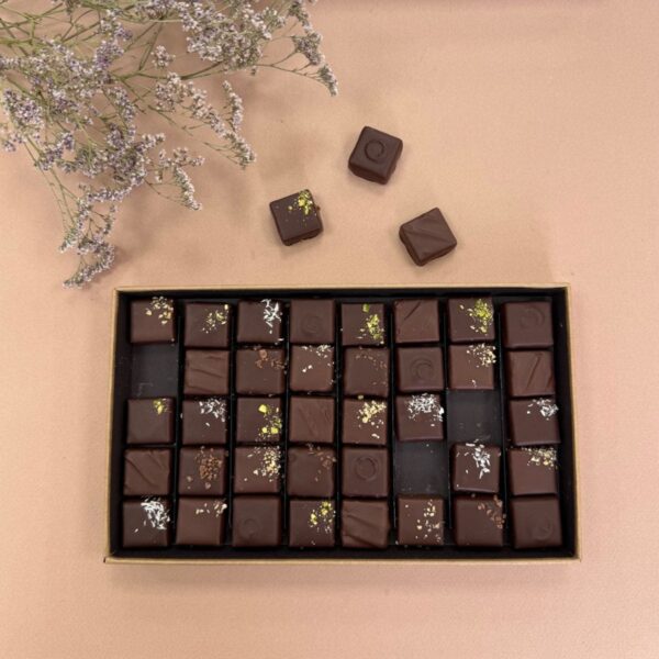 40 bonbons pralinés avec un enrobage chocolat Palo Santo Équateur et un praliné légèrement croustillant en bouche.