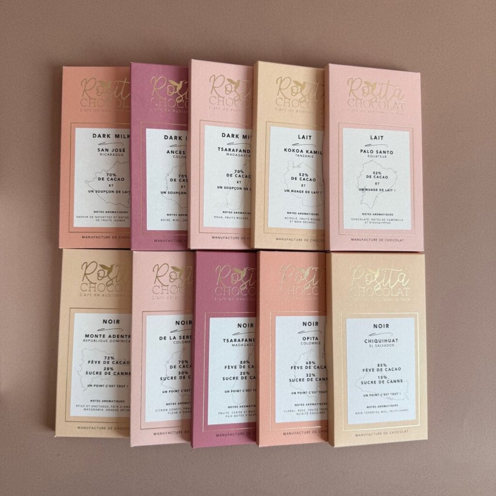 Le coffret contient 5 tablettes de chocolat noir, 3 tablettes de chocolat dark milk et 2 tablettes de chocolat au lait.