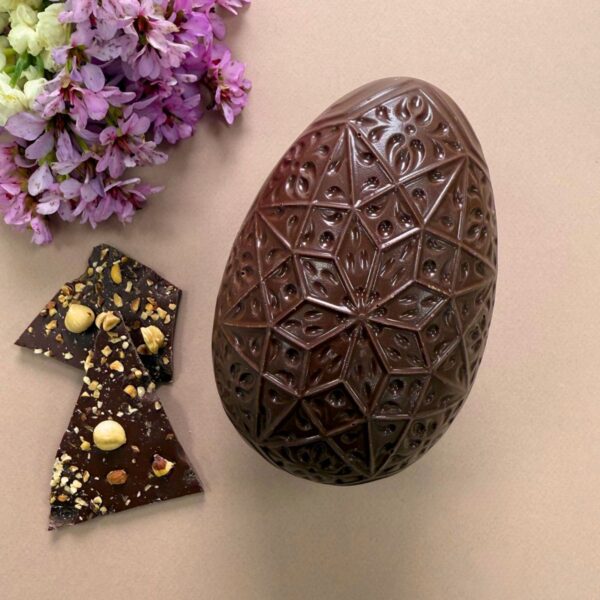 Œuf de Pâques au chocolat lait, Sao Tomé, garni de plaque chocolat noisette. Il mesure 15 cm de hauteur et 9 cm de largeur.