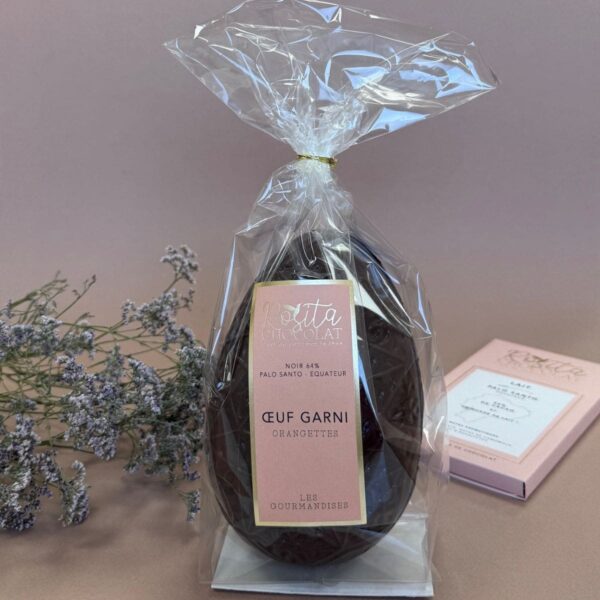 Œuf de Pâques au chocolat noir, Palo Santo, Équateur, garni d’orangettes. Il mesure 15 cm de hauteur 9 cm de largeur et a une épaisseur de 9 cm.