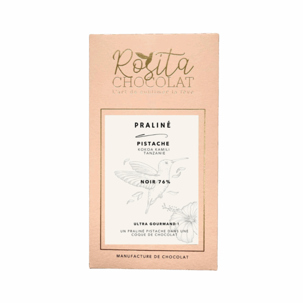 Un praliné pistache croustillant dans une coque de chocolat noir acidulé, aux notes de fruits rouges et noix séchées.